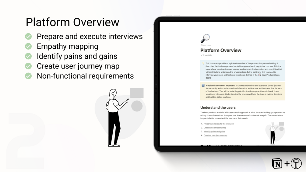 This Notion kit is a directory of resources to help you understand and execute product planning. The template directory is organized in several abstraction layers. Starting from a high-level business perspective, and then gradually drilling down to technical details. The final result is a shared vision, development plan, roadmap, based on the knowledge from all the documents included.